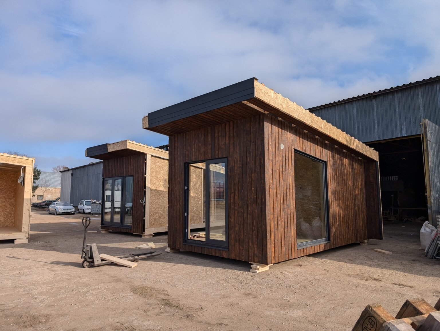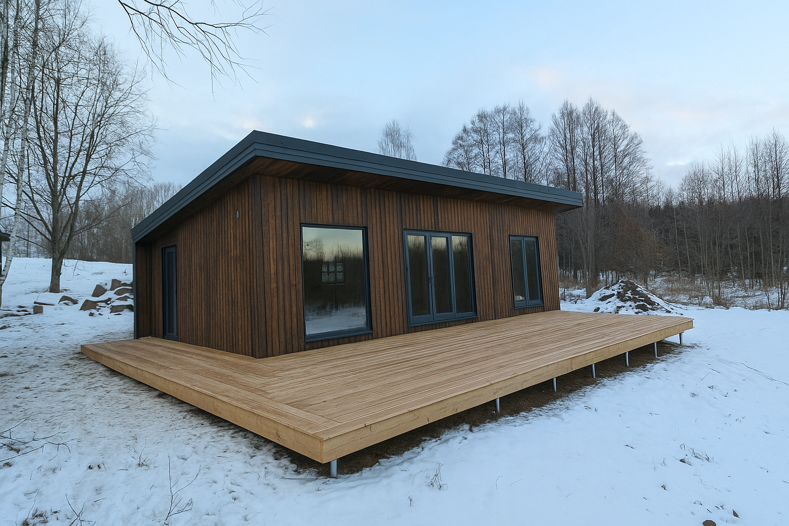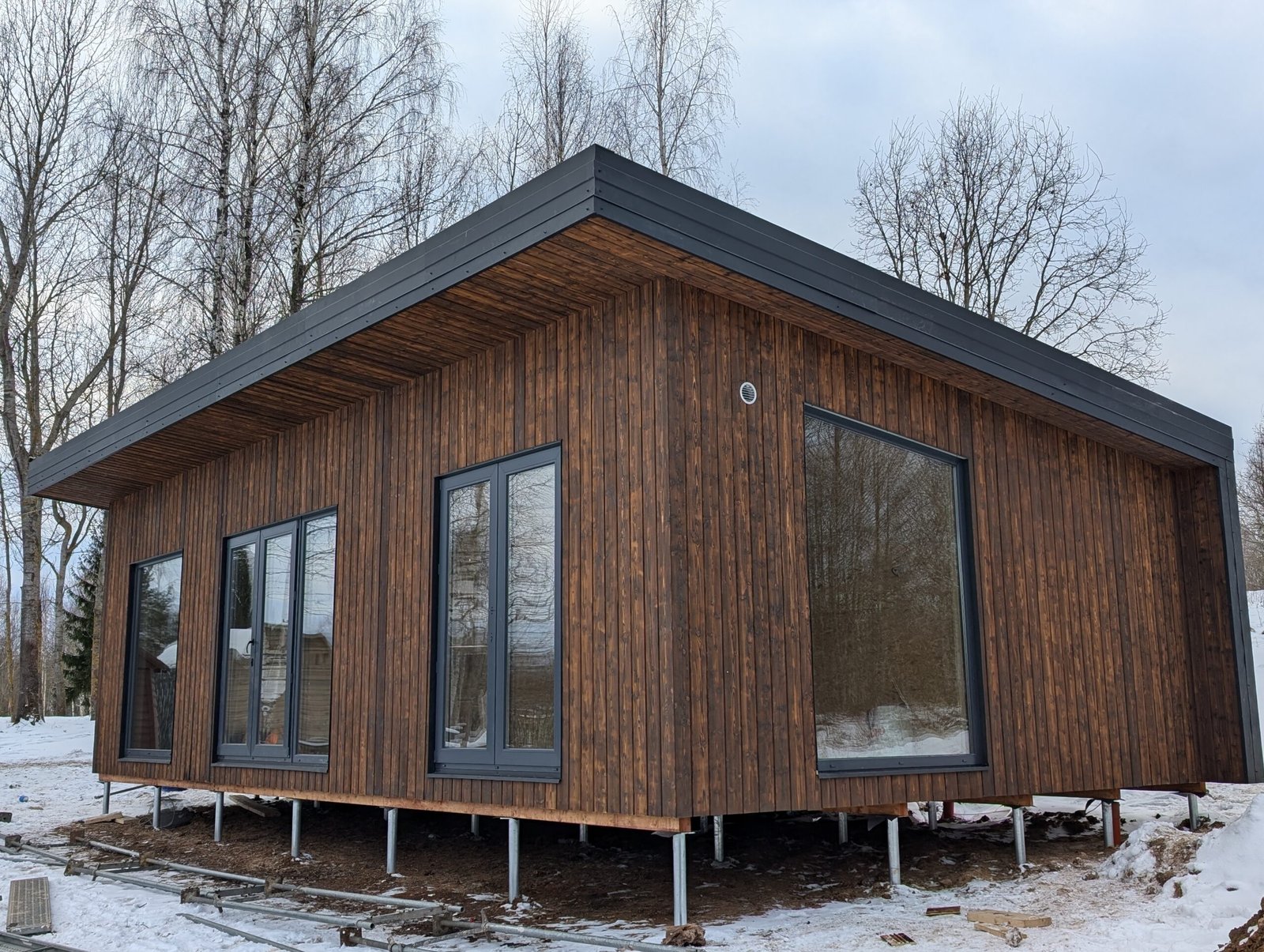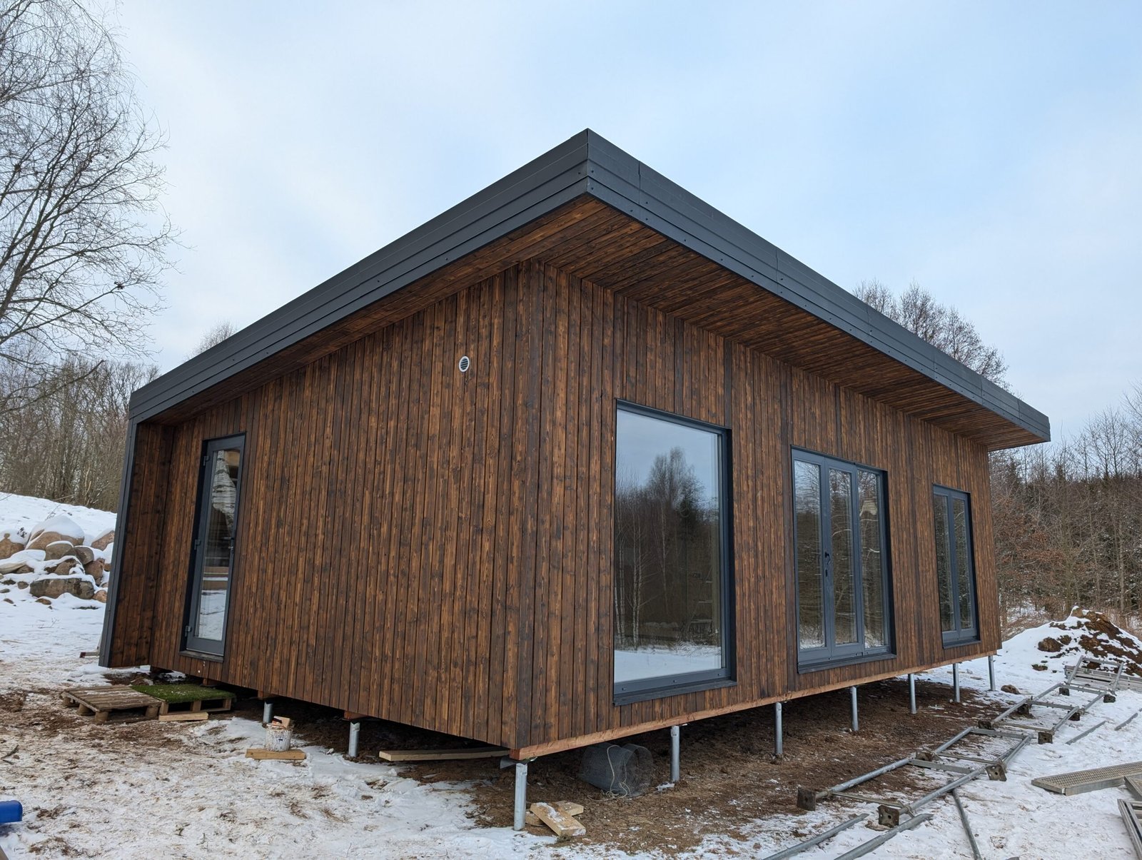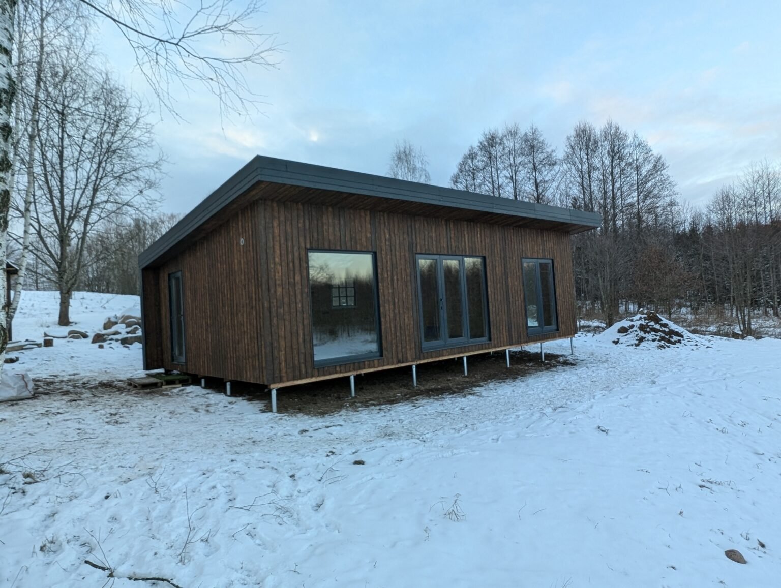 - Modulinio namo dugnas gaminamas iš 145×45 mm medienos. Ant jo skersai dedamas papildomas karkasas, apšiltintas 50 mm mineraline vata – tai padeda išvengti šalčio tiltų.